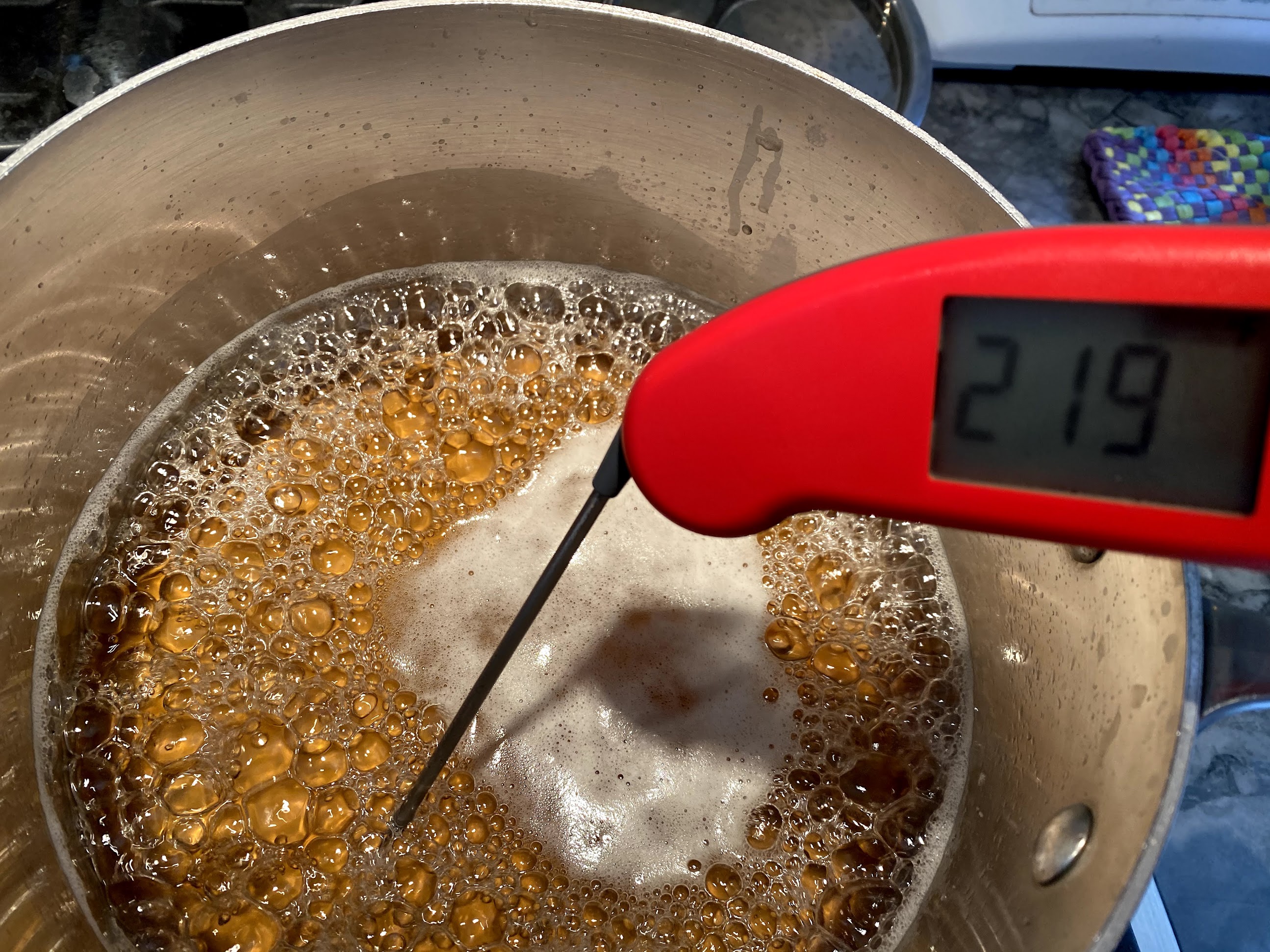 The first boil, I let it go too long and ended up with grainy, delicious maple butter. Using a Thermapen, I started to get more precise, looking for temperatures between 217 to 219 degrees: