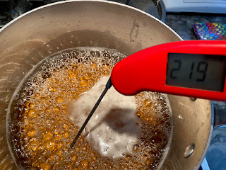 The first boil, I let it go too long and ended up with grainy, delicious maple butter. Using a Thermapen, I started to get more precise, looking for temperatures between 217 to 219 degrees: