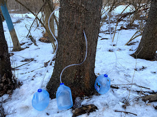 We were on a walk the other morning and saw three maple trees tapped in a neighbor's yard. I thought to myself, "hey, we have maple trees in our back yard and a tap from a past maple festival," so when we got home, I got to work. I knew from attending maple festivals in the past that the weather was currently perfect for sugaring - under freezing at night, and over freezing during the day.