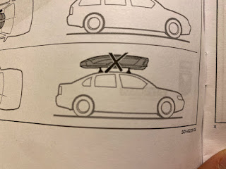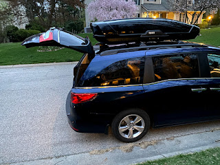 Eventually, I decided that a roof box was the way to go. My local dealer did a fine job installing the roof rails and crossbars, and we ended up selecting the biggest possible roof box we could find - the Thule Motion XT XXL. Good grief, it's a big beastie. At over 7.5 feet long, more than three feet wide, and 1.5 feet tall, it represents an additional 22 cubic feet of space. The thinking is that everything we need to sleep, including 9-person tent, camp chairs, camp table, and assorted tarps will fit easily. Since it is so long, I'm also thinking that we can be more efficient from a packing standpoint by putting the sleeping bags in there, unrolled and flat. We shall see, as we need to do a variety of test loads to determine what will fit while staying within the 165 pound load limit of the box itself.